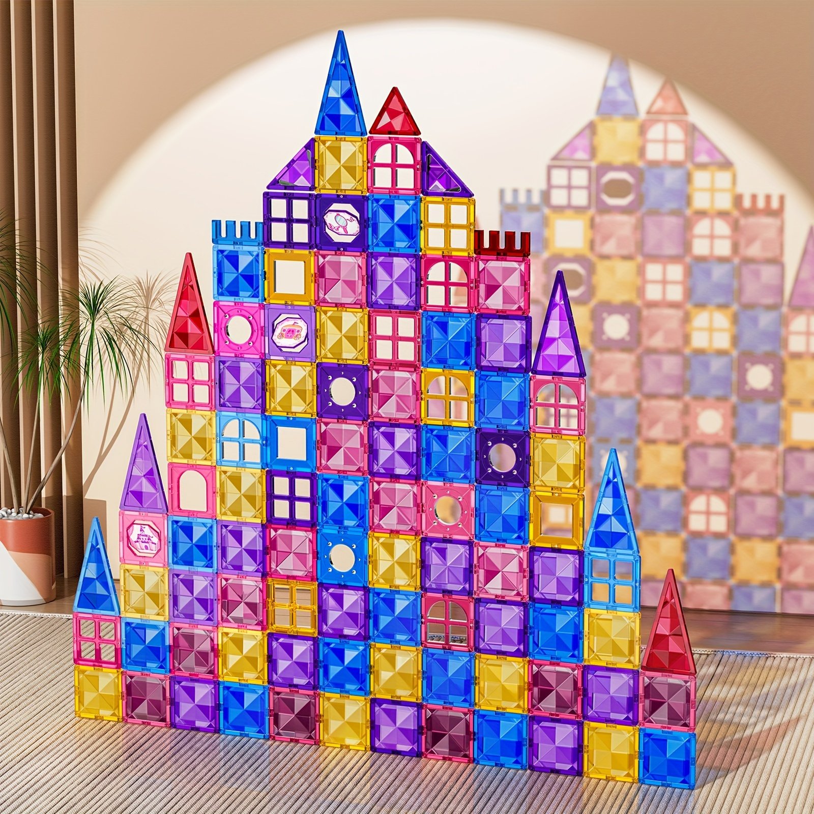 Choose your size: 52 Pieces OR 97 Pieces of vibrant, geometric magnetic tiles (squares, triangles, windows, and more).